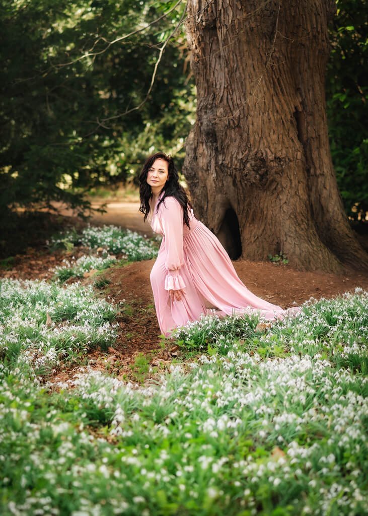 As if in a timeless realm where every flower tells a story, this image captures a woman in a moment of quietude. Her pink dress drapes elegantly as she kneels, a contrast against the rugged backdrop of the tree, her expression one of contemplation. This isn’t just a photograph—it’s a celebration of the moments we steal away from the rush of life, a visual whisper of the soul’s dialogue with the earth, resonating with the soft, yet profound, voice of nature.